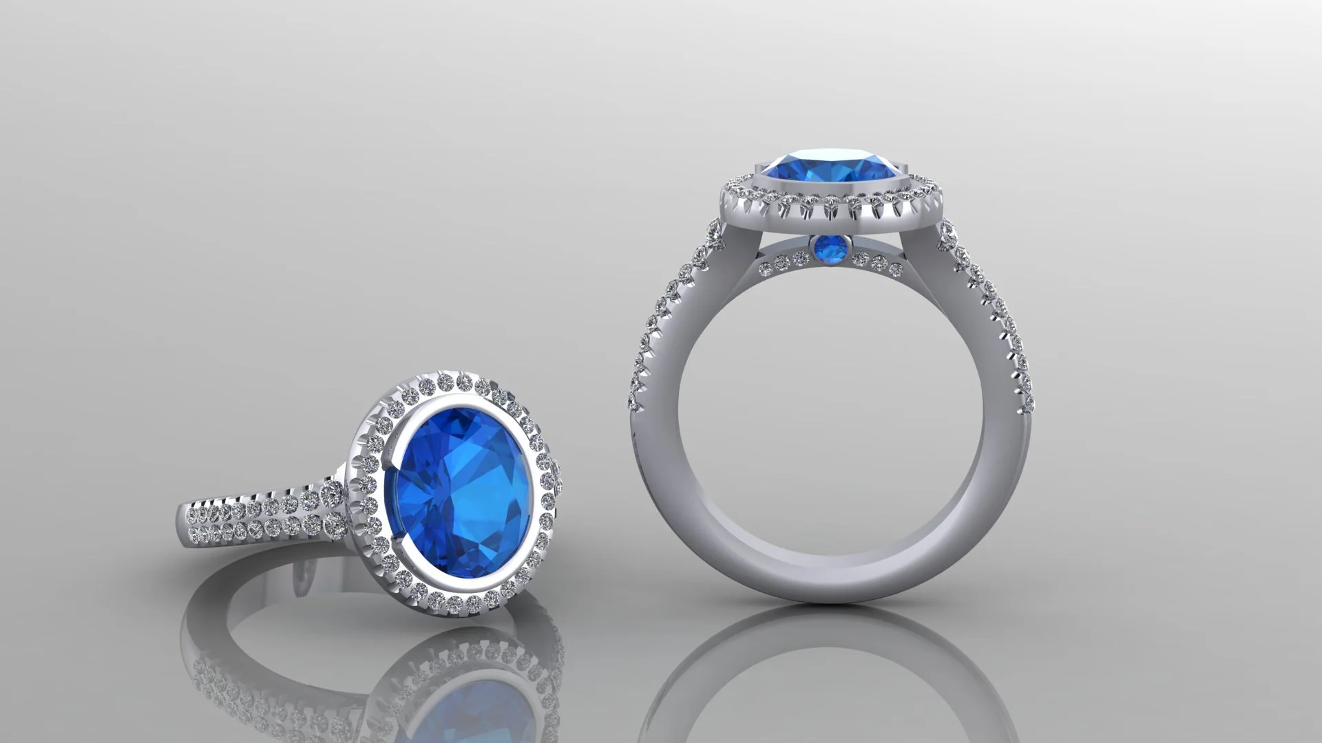 This CAD render has a halo of diamonds surrounding the bezel set blue sapphire and secret stones on the under carriage.